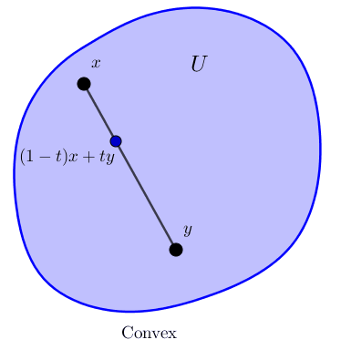 Definition: A subset $U$ of a vector space is convex if whenever $x,y \in U$, the line segment from $x$ to $y$ lies in $U$. That is, if the convex combination $(1-t)x+ty$ is in $U$ for all $t \in [0,1]$. Sometimes we write $[x,y]$ for this line segment. Theorem: Let $x \in \R^n$ and $r \ge 0$. The ball $B(x,r) \subset \R^n$ (using the standard metric on $\R^n$) is convex. |