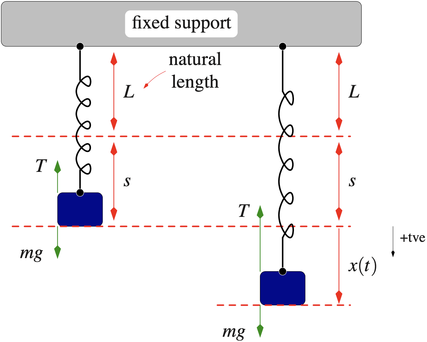 $F= \underbrace{-k(s+x)}_{\text{restoring force}}+ \underbrace{m g}_{\text{gravitational force}}$