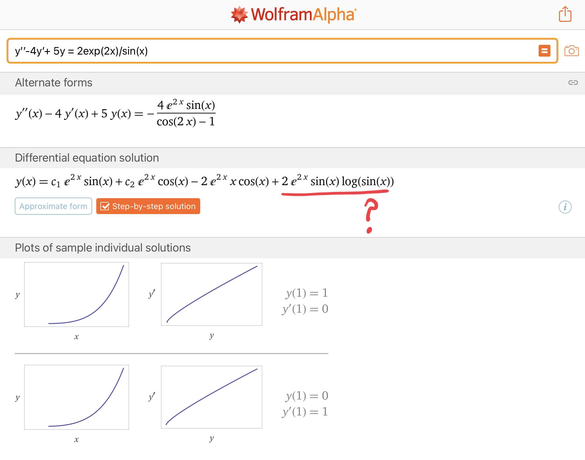 | $y_p'' = e^{2 x} \big(\sin x U'' + 2 U' (2 \sin x + \cos x) + U (3 \sin x + 4 \cos x)\big).$ |