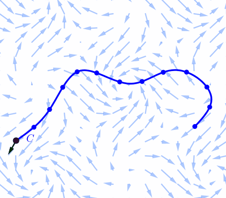 Consider a force field $\F(x,y)$ and a piecewiese continuous smooth curve $C.$ We wish to compute the work done by this force in moving a particle along a smooth curve $C.$ We divide $C$ into subarcs $P_{i-1}$-$P_i$ with lengths $\Delta S_i$ by dividing the parameter interval $[a, b]$ into subintervals of equal width. |