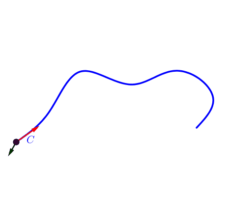 Let $\r(t) =x(t)~\i+y(t)~\j$ be a parametrisation of the curve $C$ with $t\in[a,b].$ Then the unit tangent vector to $C$ is