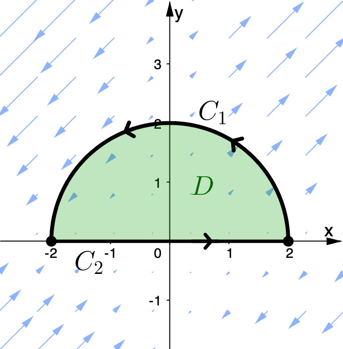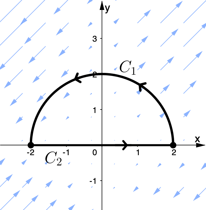 across the curve from $(2,0)$ to $(-2,0)$ via the semicircle of radius 2 centred at the origin (for $y\geq 0$) followed by the straight line from $(-2,0)$ to $(2,0).$