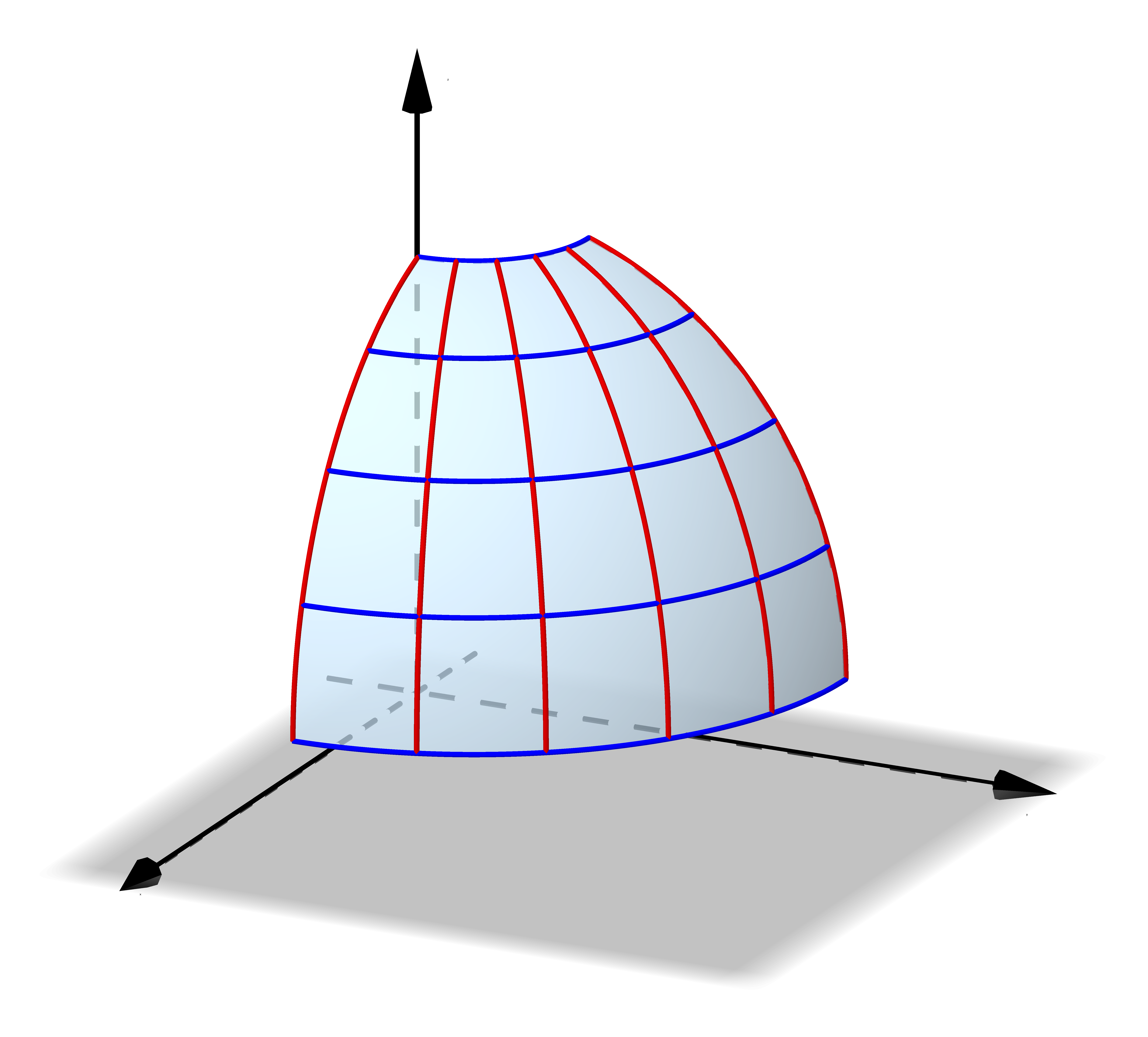 For $S_2$: Now we have a half sphere of radius 1. Then the parametrisation is \[ \r(\theta,\phi ) = \cos\theta \sin \phi~\i+ \sin\theta \sin \phi ~\j+\cos \phi~\k \] where $0\leq \theta \leq 2 \pi$ and $0 \leq \phi \leq \pi/2$. Then $ \quad \r_{\theta} = -\sin\theta \sin \phi~\i+ \cos\theta \cos \phi ~\j+0~\k $ $ \quad \r_{\phi} = \cos\theta \cos \phi~\i+ \sin\theta \cos \phi ~\j- \sin \phi~\k $ |