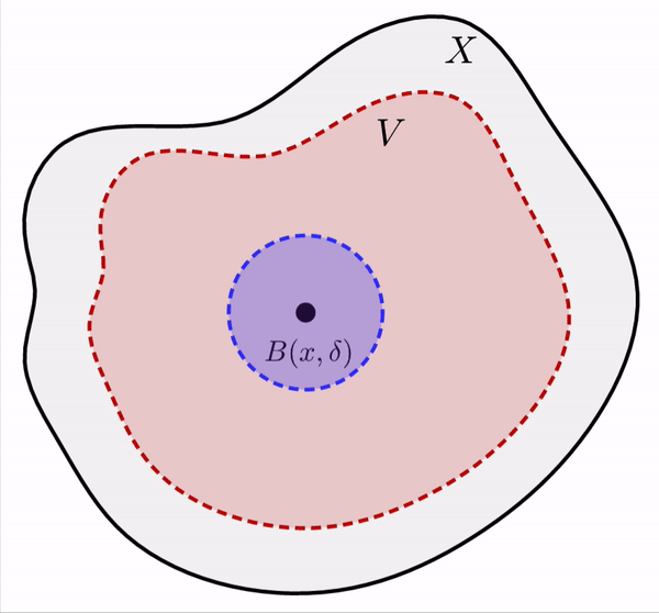 Definition: Let $(X,d)$ be a metric space. A subset $V \subset X$ is open if for every $x \in V$, there exists a $\delta \gt 0$ such that $B(x,\delta) \subset V$. A subset $E \subset X$ is closed if the complement $E^c = X \setminus E$ is open. When the ambient space $X$ is not clear from context, we say $V$ is open in $X$ and $E$ is closed in $X$. If $x \in V$ and $V$ is open, then we say $V$ is an open neighborhood of $x$ (or sometimes just neighborhood). |